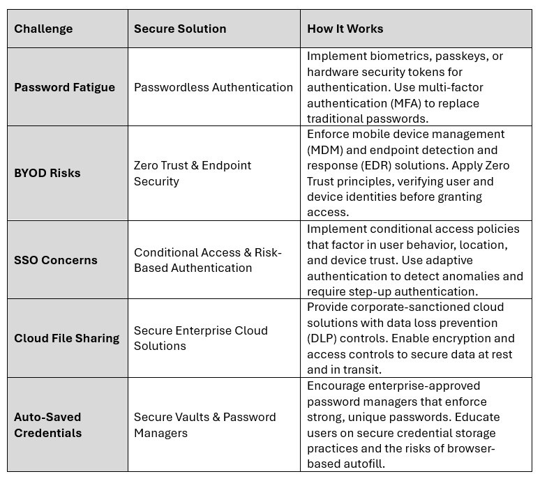 To effectively mitigate these challenges while maintaining a seamless user experience, organizations must implement strategic security solutions that align with user expectations. The approach should integrate secure-by-design principles, leverage advanced authentication technologies, and enforce intelligent policies that enhance security without introducing unnecessary friction. Additionally, continuous user awareness and training on new and updated processes are essential to ensure users understand security best practices and their role in safeguarding systems. Empowering employees with knowledge helps bridge the gap between security policies and user compliance, fostering a security-conscious culture across the organization.