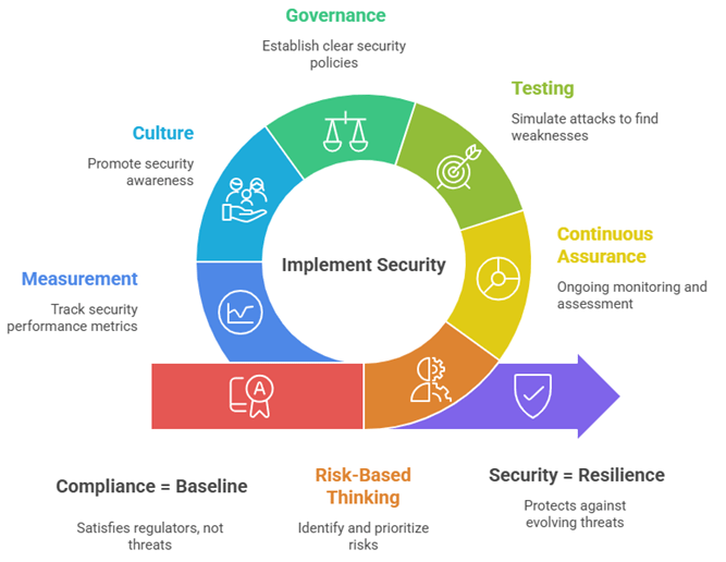 Compliance sets the minimum standard; security transforms it into a living system that defends, detects, and adapts.