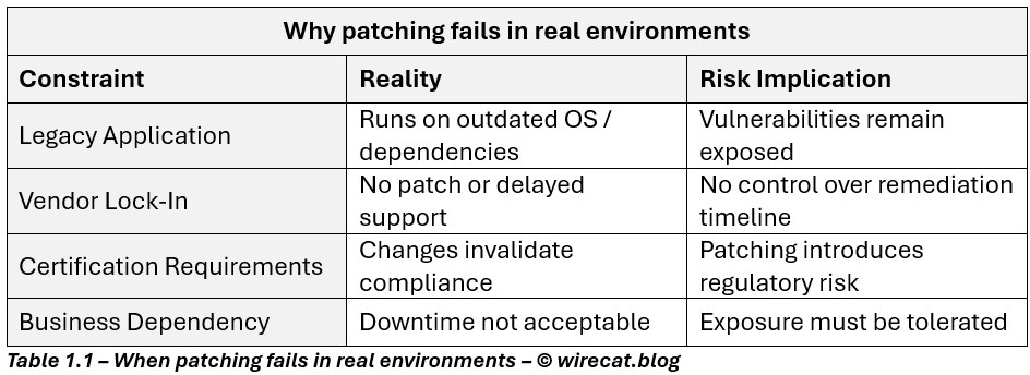 When one of the core risk treatments, patching, is unavailable, risk does not pause. It accumulates.