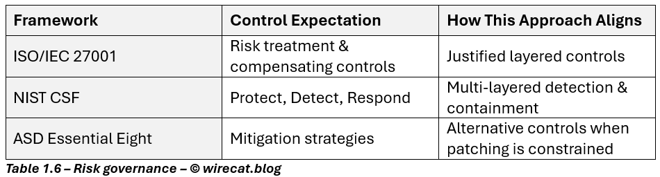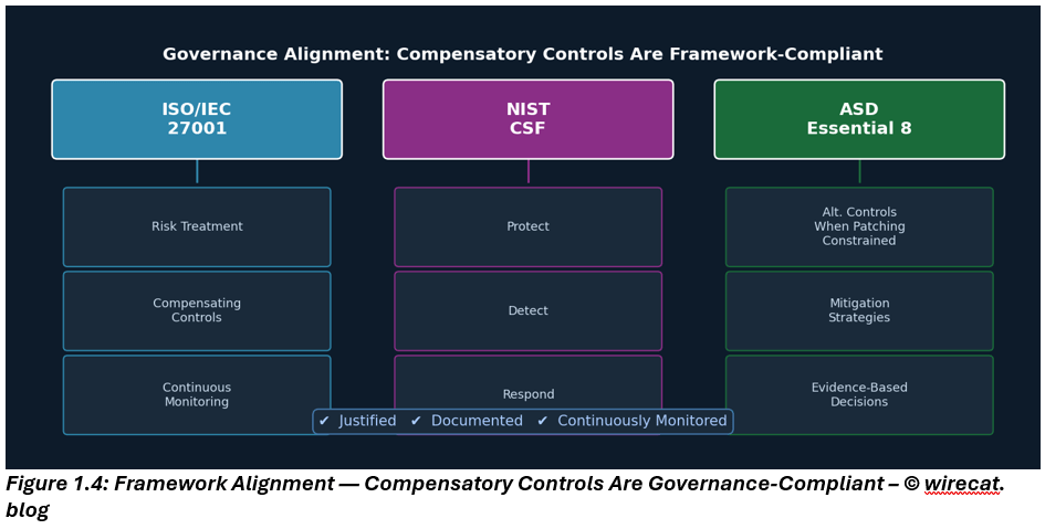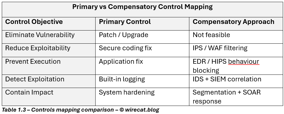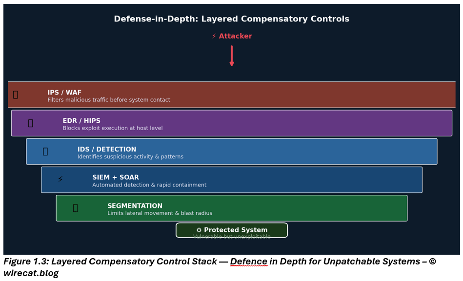This is where mature security teams diverge from checkbox security. When the primary security control, timely patching, is unavailable, risk management does not stop. Instead, organizations invoke compensatory controls that provide equivalent or partial risk reduction until the primary control can be restored or the system retired.