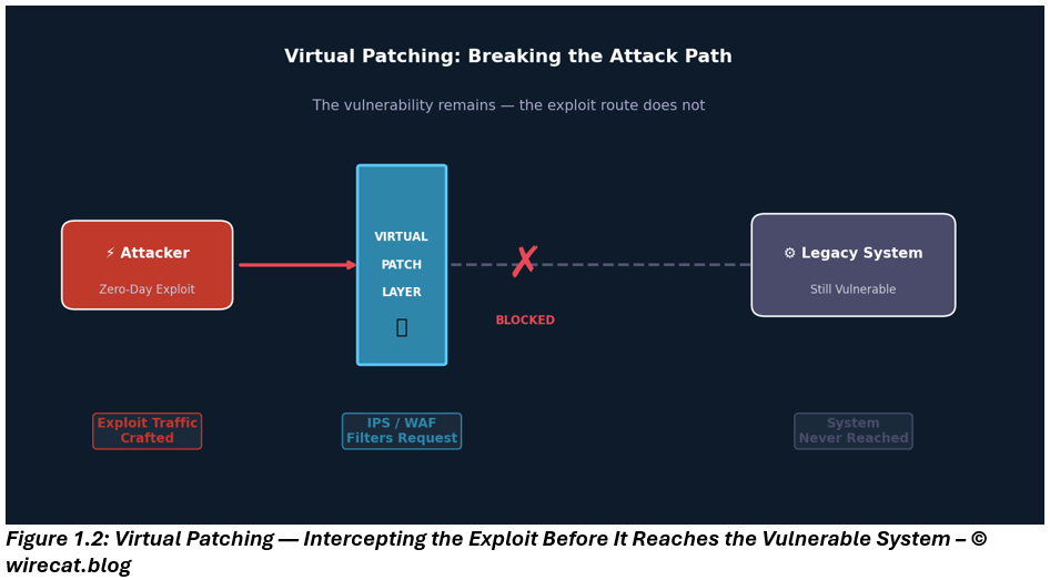 Virtual patching and exposure reduction are deliberate compensatory risk treatments, invoked when the primary control is unavailable and sustained until patching, system replacement, or decommissioning becomes possible.
