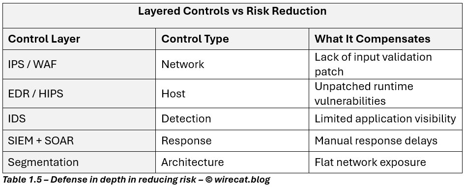 Traffic-level enforcement (IPS, WAF): Reduces exploit success by filtering malicious traffic before it reaches the system.